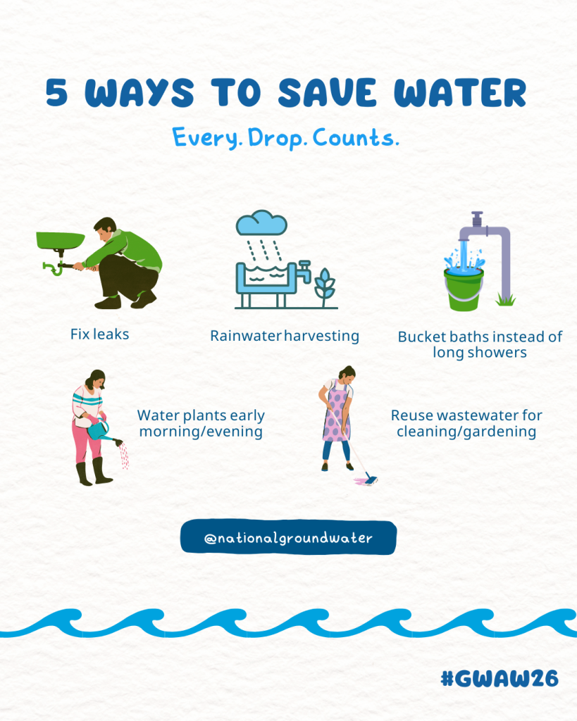 So this Groundwater Awareness Week, try something new! Whether it’s a bucket bath, planting native flowers, trees, and bushes that use less water, harvesting rainwater, or cutting your shower time, every drop counts.